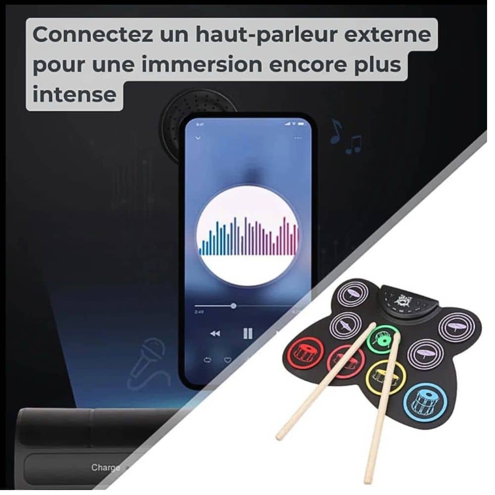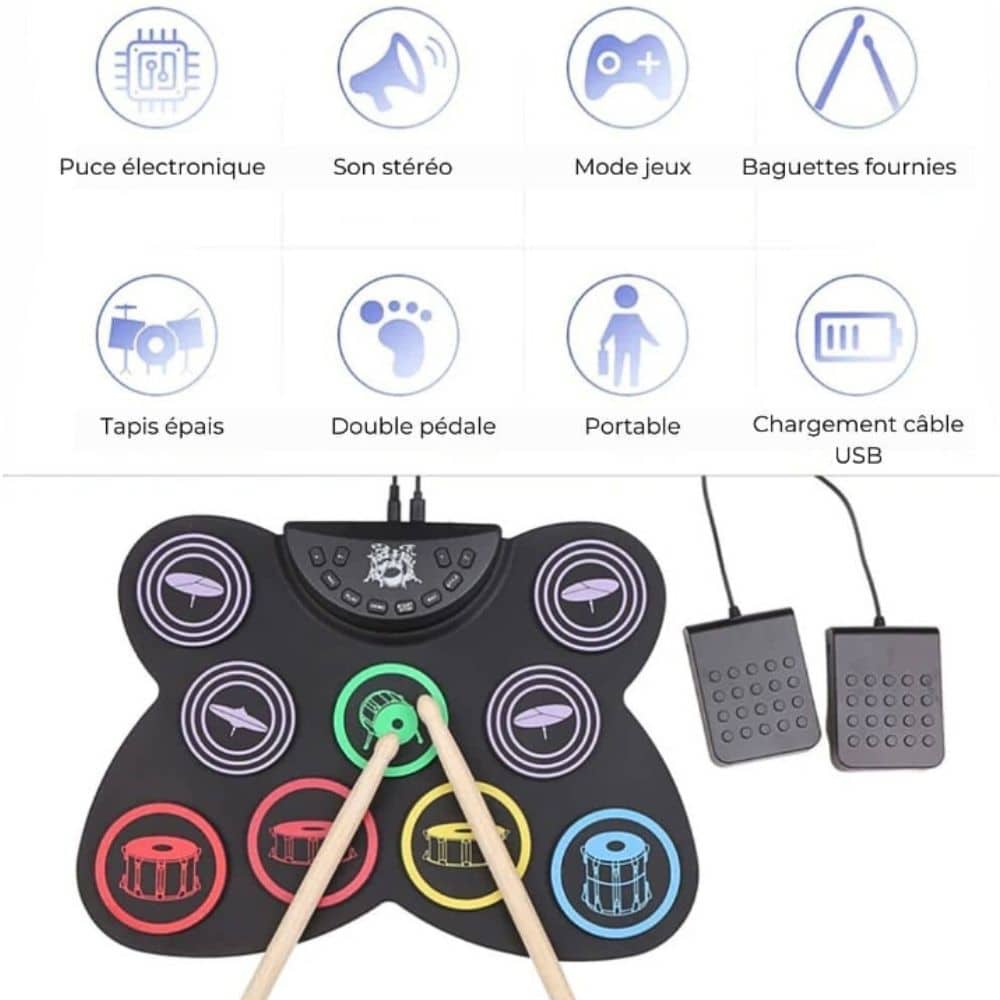 Notre batterie électronique est une alternative idéale pour les parents cherchant un instrument silencieux et pratique. Conçue spécialement pour les débutants, elle est waterproof, facile à nettoyer et s’enroule même pour un rangement pratique.