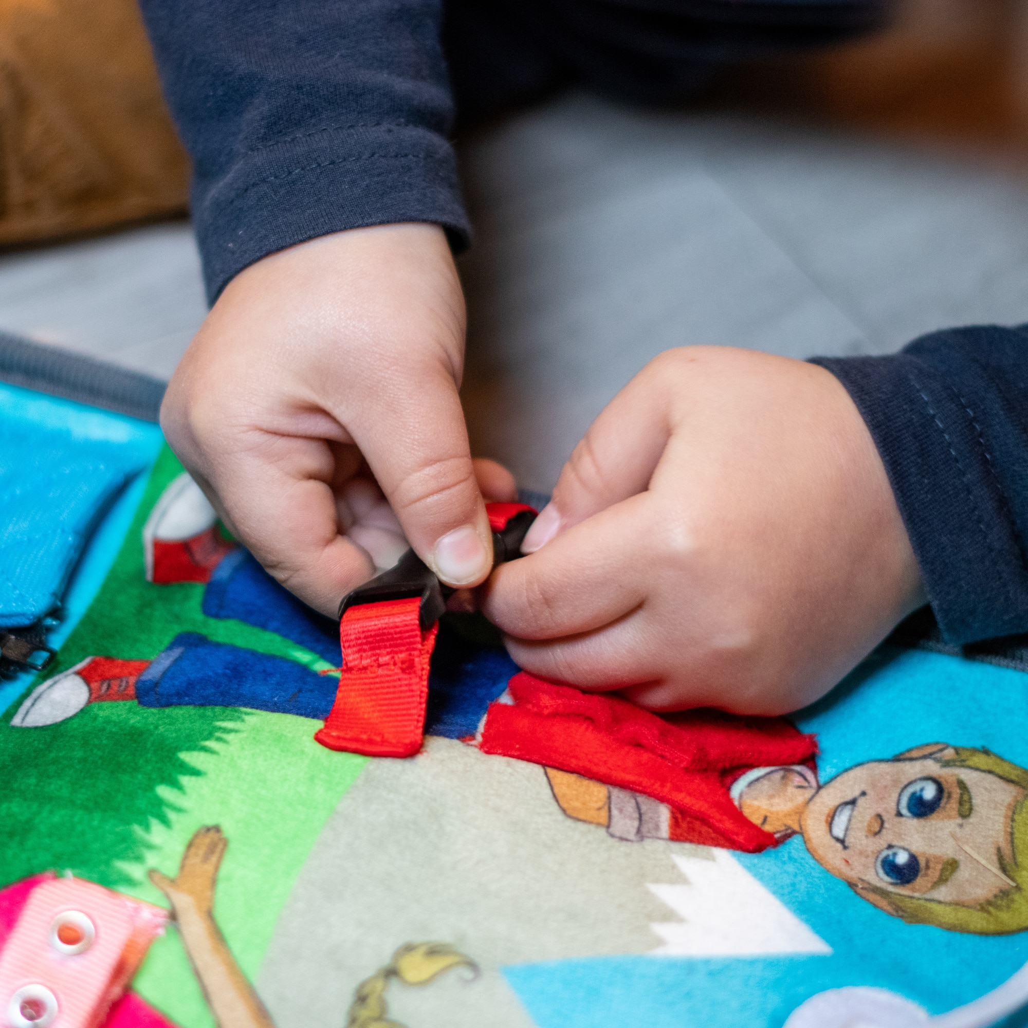 Cette Busyboard est un jouet réaliste qui permettra à votre enfant de découvrir les mécanismes de fermeture (lacets, boutons, zip, etc.) qu’il rencontrera quand il sera plus grand.